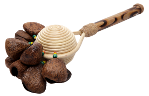 Этот экзотический маракас сделан из натуральных компонентов - ротанговой пальмы, плодов дерева кукуи, похожих на орех.